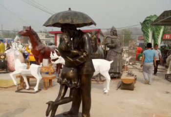 銅雕傘情侶接吻雕塑,在景區(qū)擁抱浪漫